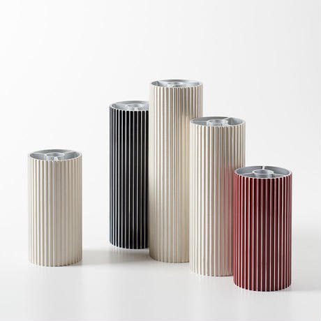金属を型から押し出して成形する押出材に塗りを施した一輪挿し。凹凸のある表面を根来塗りのように研ぎ出す事で、アルミと塗りの縞模様が浮かび上がる。